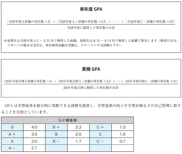2019 年度より GPA(単年度 GPA および累積 GPA)制度を導入します。GPA(Grade Point Average)とは、個々の学生が受講した科目の習熟度の平均を試算結果により表すもので、成績証明書などに表示されます。